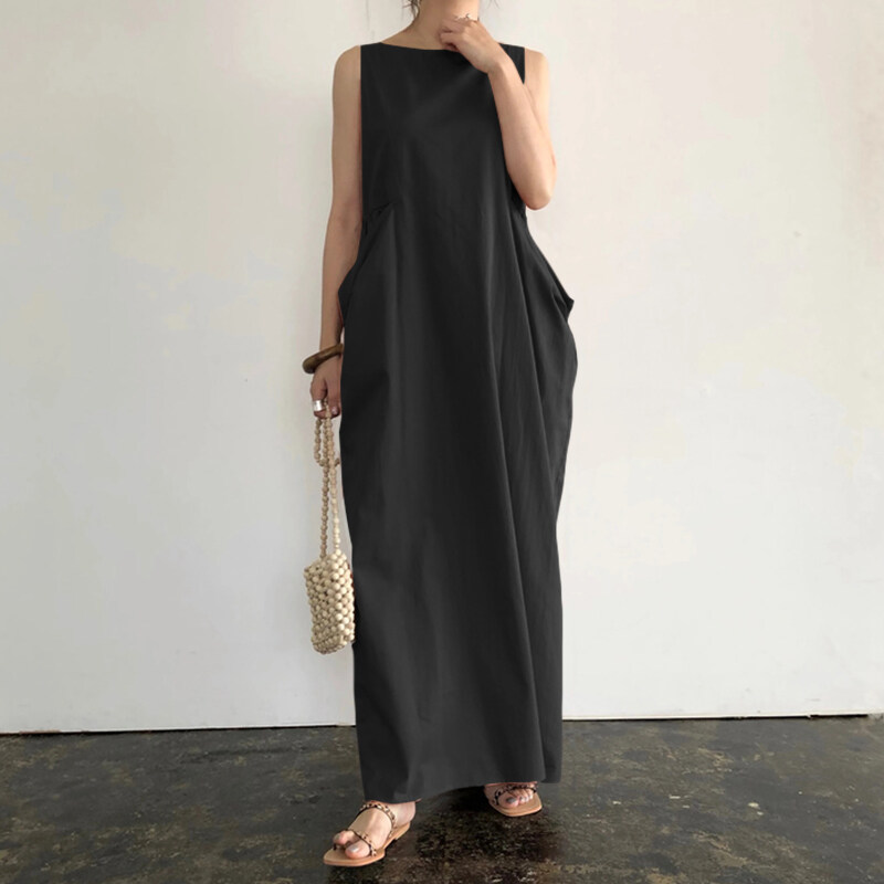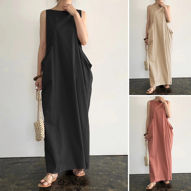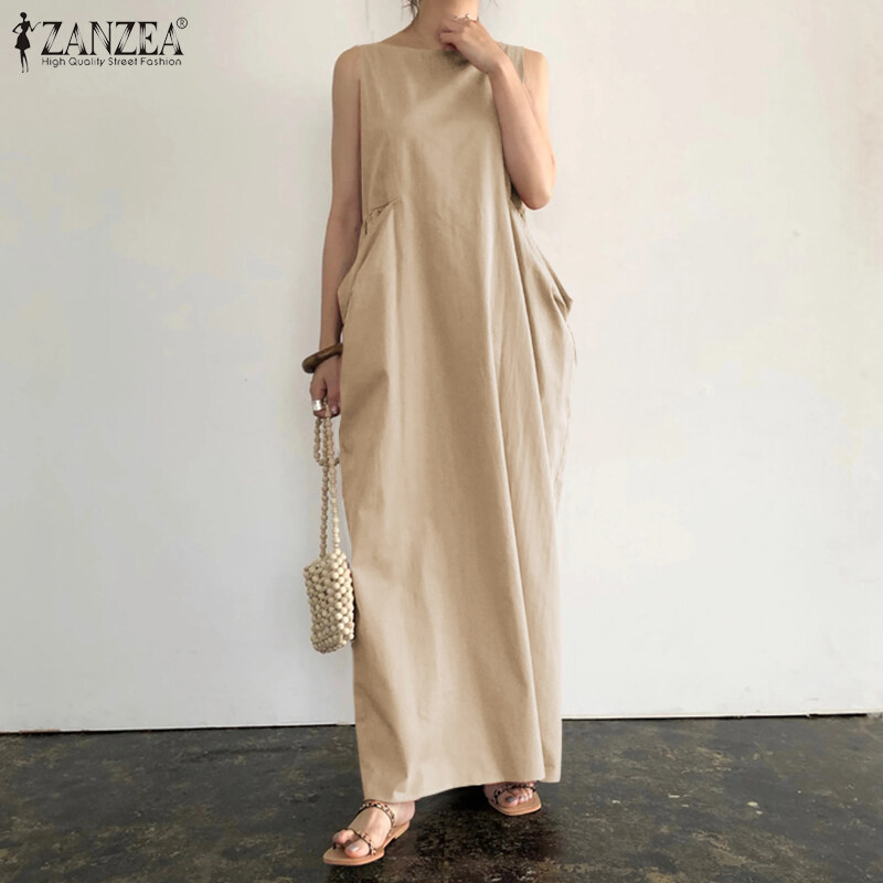 ZANZEA Women Plain Color Long Maxi Sleeveless O-Neck Summer Dress Plus Size Dress
