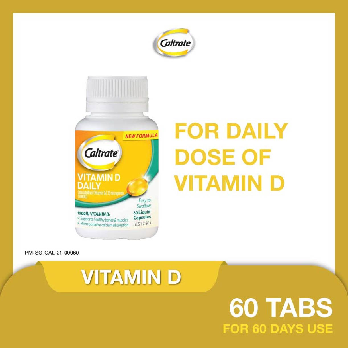 Caltrate® Vitamin D 1000IU is a once daily Vitamin D supplement. Each capsule provides 1000IU of Vitamin D3 in a convenient, easy to swallow liquid capsule. It is essential to support healthy bones and Calcium absorption and is from a trusted Calcium brand, Caltrate®.