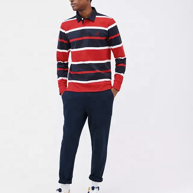Oem Custom Embroidered Logo 100% Cotton Polo Shirt Tops Long Sleeves Striped Casual Rugby Polo Shirt For Men