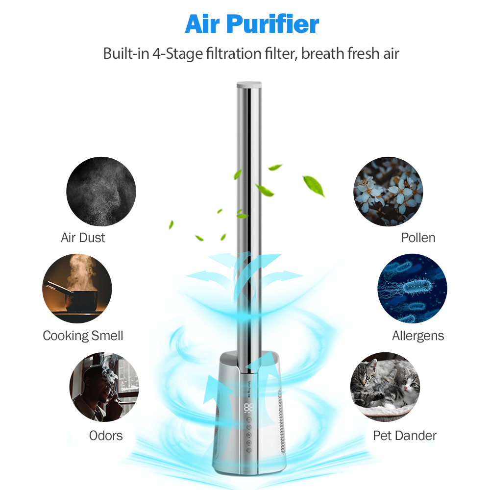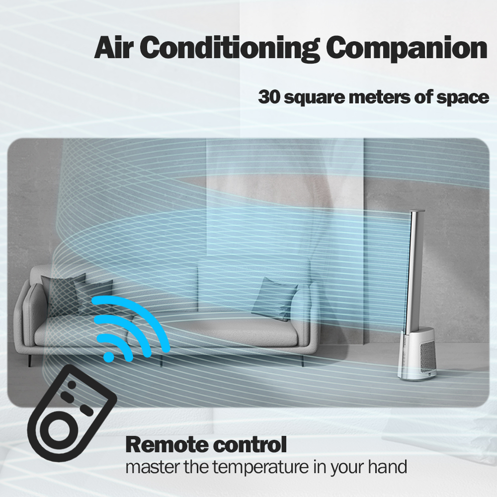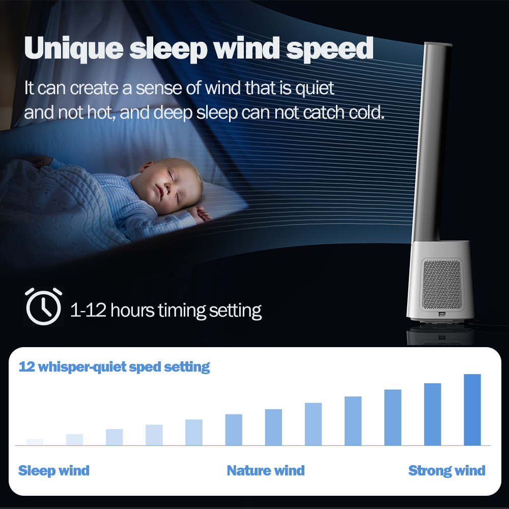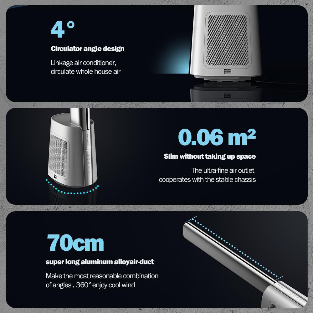 Bladeless air outlet,70CM super long air-duct; 4°Circulator angle design Linkage air conditioner,circulate whole house air; 12-speed wind speed adjustment to meet the needs of multiple scenarios ; 1-12 hours long timing setting design; Slim without taking up space ,the base of fan is only 0.06 square meters; Automatically shaking left and right , swing angle 60°,90°,120°adjustable; Shut down automatically return to positive ; Wind of Normal , natural and sleep wind, a variety of wind types are optional; 6m wireless remote control; Activated carbon adsorption purification module, adsorption pollution, fresh air;