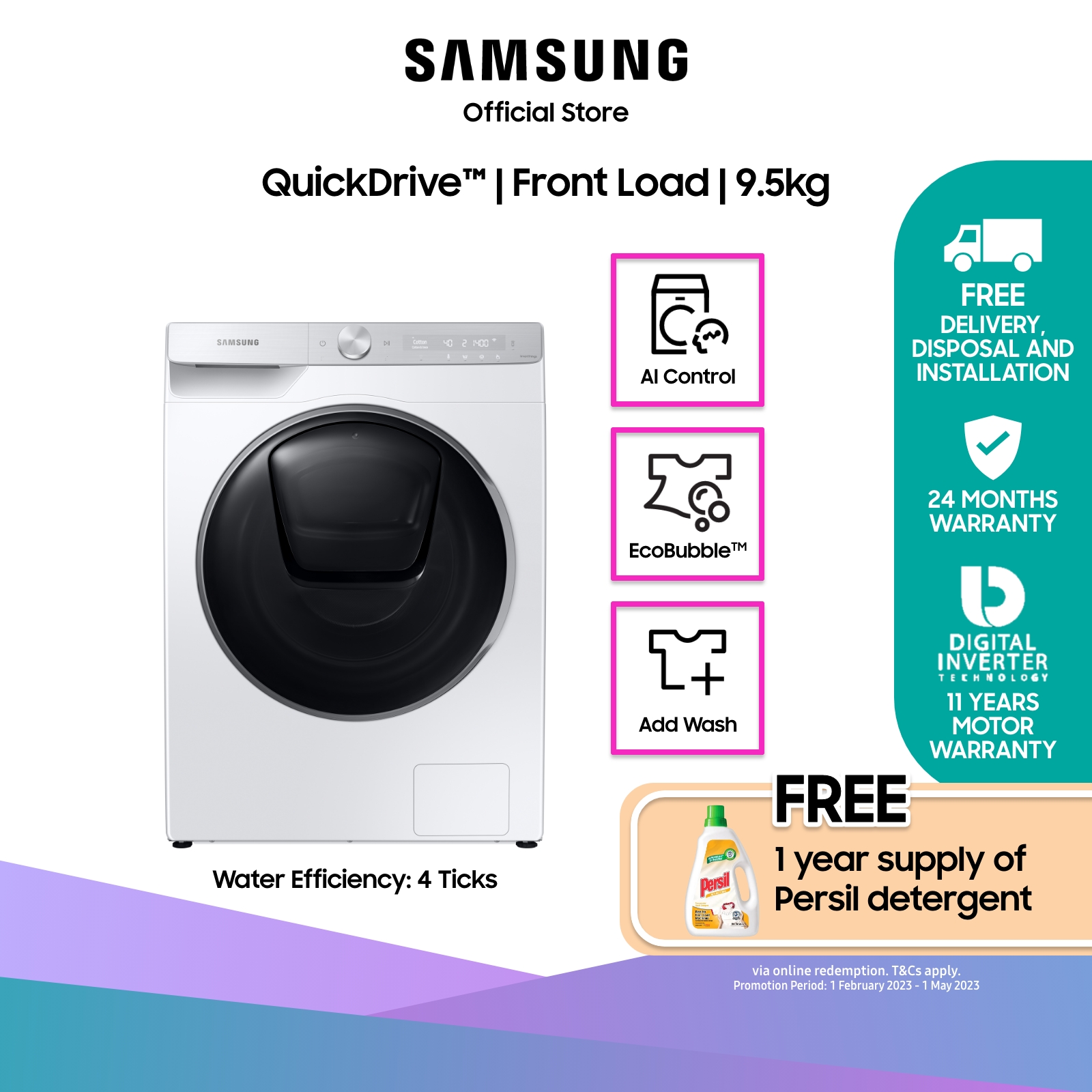 [Bulky] SAMSUNG WW95T984DSH/SP, Front Load Washing Machine, 9.5KG, 4 Ticks, with QuickDrive™