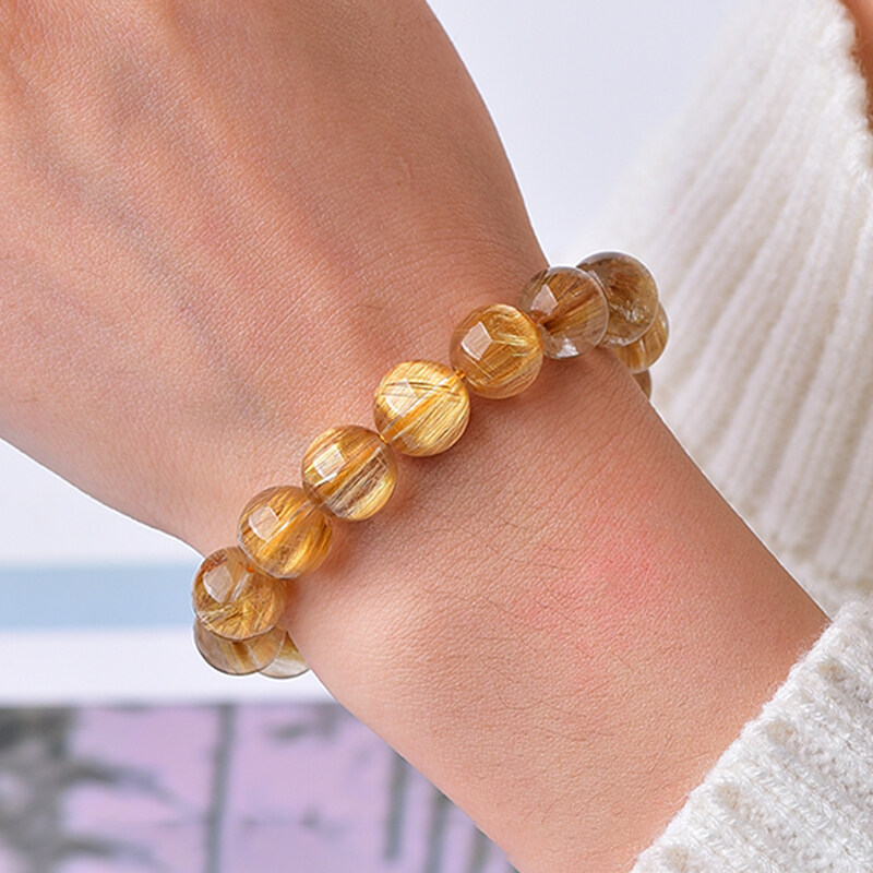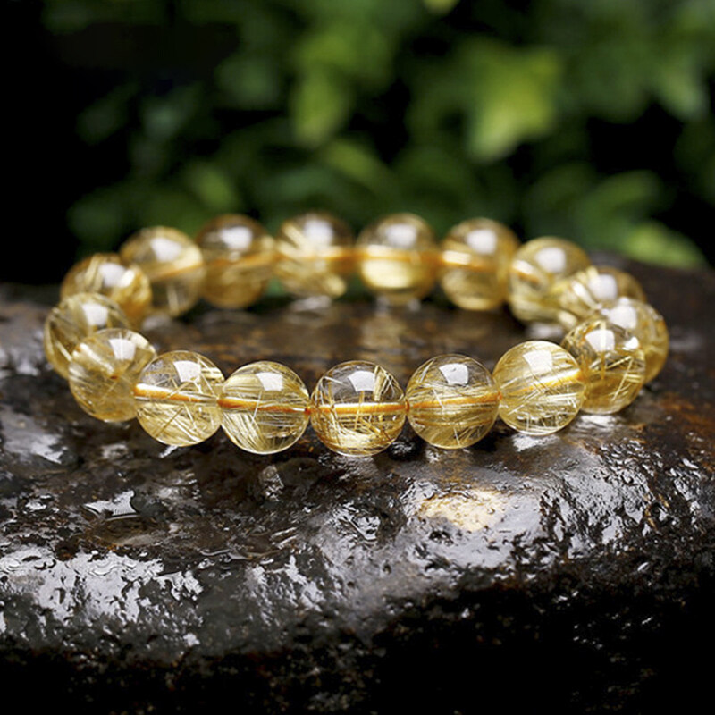 Natural Brazilian Titanium Gold Crystal Bead Bracelet Yellow Crystal Bead Quartz Healing Collection Grade Hair Crystal Single Circle Men's and Women's Lucky Bead Jewelry Bracelet Male Lucky Bracelet