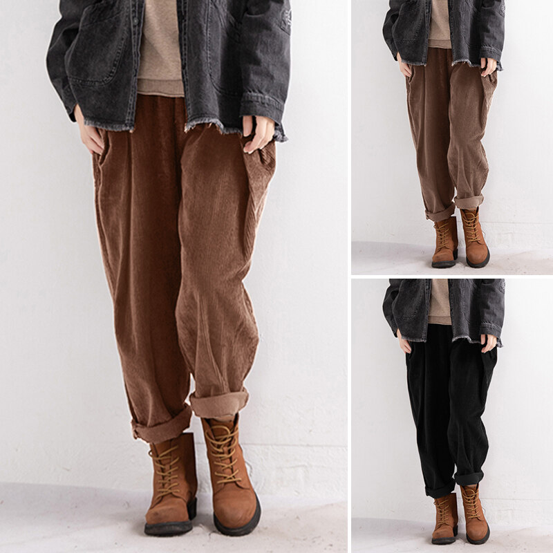 ZANZEA Women Elastic Waist Corduroy Wide Leg Pants Casual Loose Baggy Harem Trousers #8