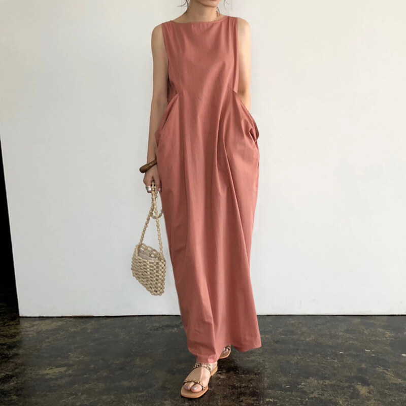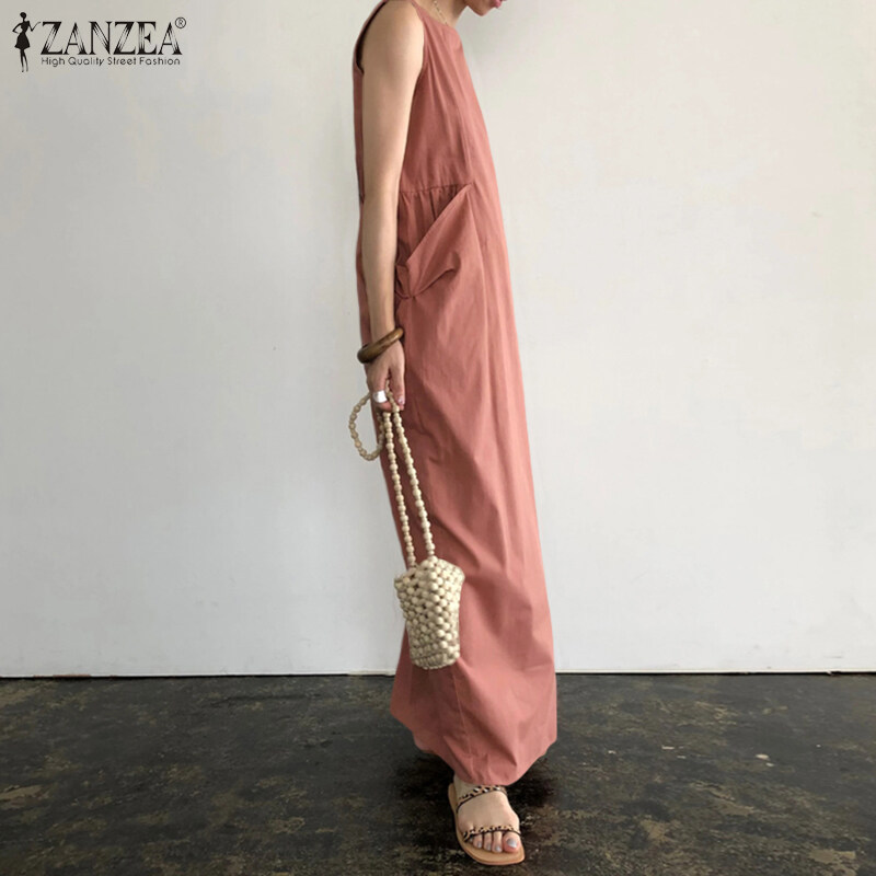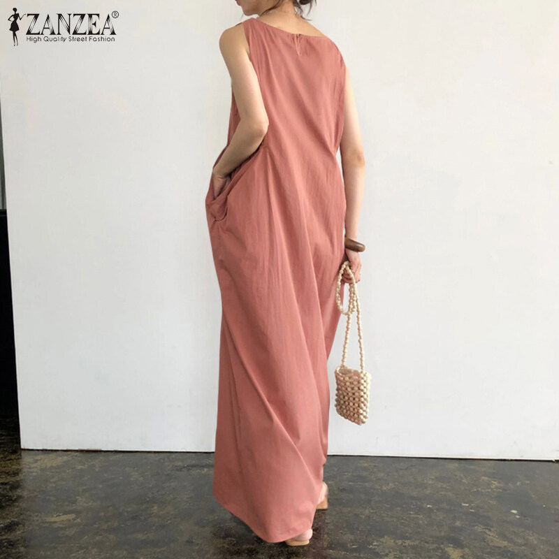 ZANZEA Women Plain Color Long Maxi Sleeveless O-Neck Summer Dress Plus Size Dress