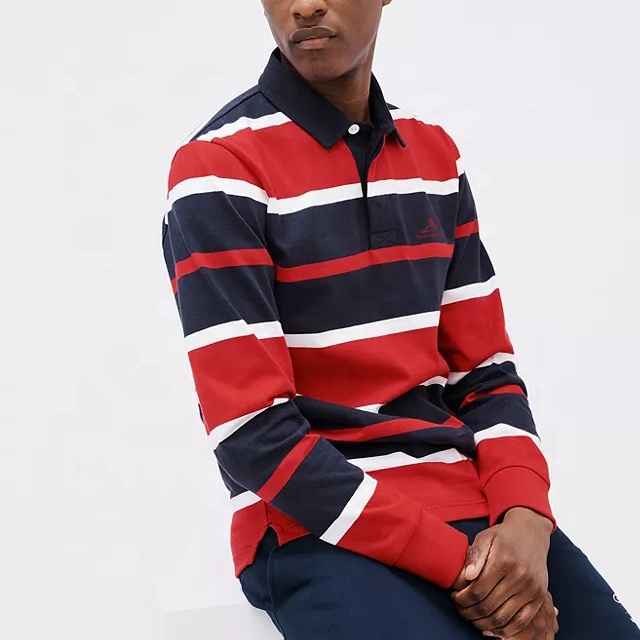 Oem Custom Embroidered Logo 100% Cotton Polo Shirt Tops Long Sleeves Striped Casual Rugby Polo Shirt For Men