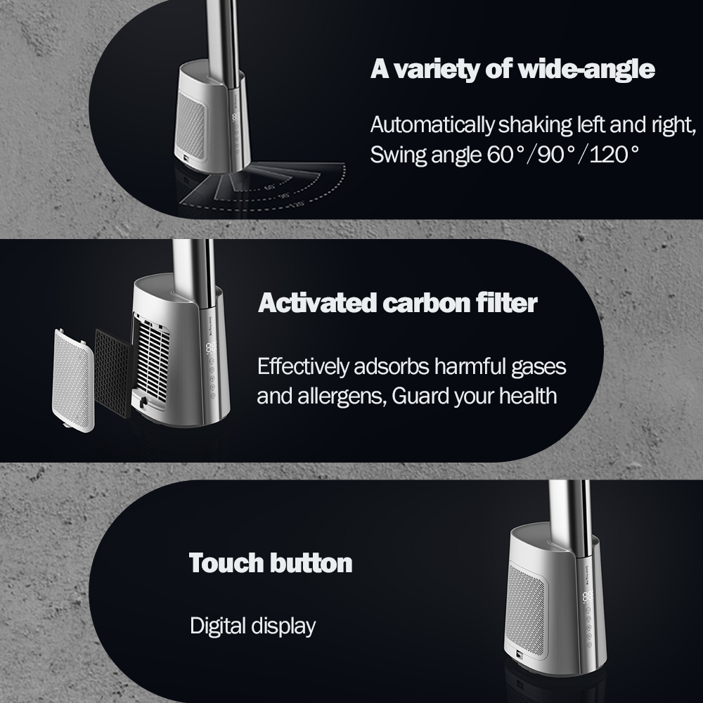 Bladeless air outlet,70CM super long air-duct; 4°Circulator angle design Linkage air conditioner,circulate whole house air; 12-speed wind speed adjustment to meet the needs of multiple scenarios ; 1-12 hours long timing setting design; Slim without taking up space ,the base of fan is only 0.06 square meters; Automatically shaking left and right , swing angle 60°,90°,120°adjustable; Shut down automatically return to positive ; Wind of Normal , natural and sleep wind, a variety of wind types are optional; 6m wireless remote control; Activated carbon adsorption purification module, adsorption pollution, fresh air;