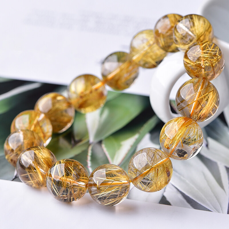 Natural Brazilian Titanium Gold Crystal Bead Bracelet Yellow Crystal Bead Quartz Healing Collection Grade Hair Crystal Single Circle Men's and Women's Lucky Bead Jewelry Bracelet Male Lucky Bracelet