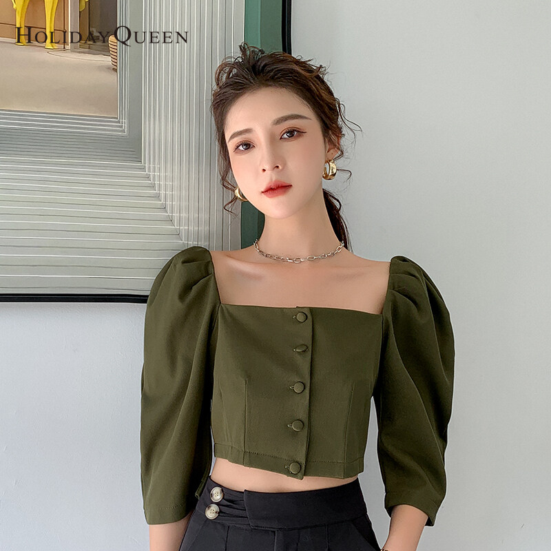 HolidayQueen Autumn Women's New Style Short Square Neck Puff Sleeve French Design Khaki Shirt S M L XL Free Shipping HQ0524