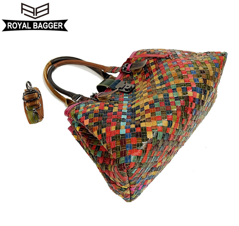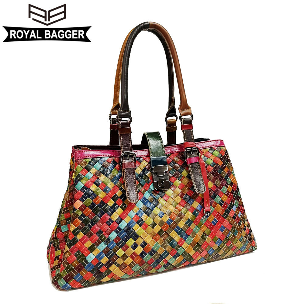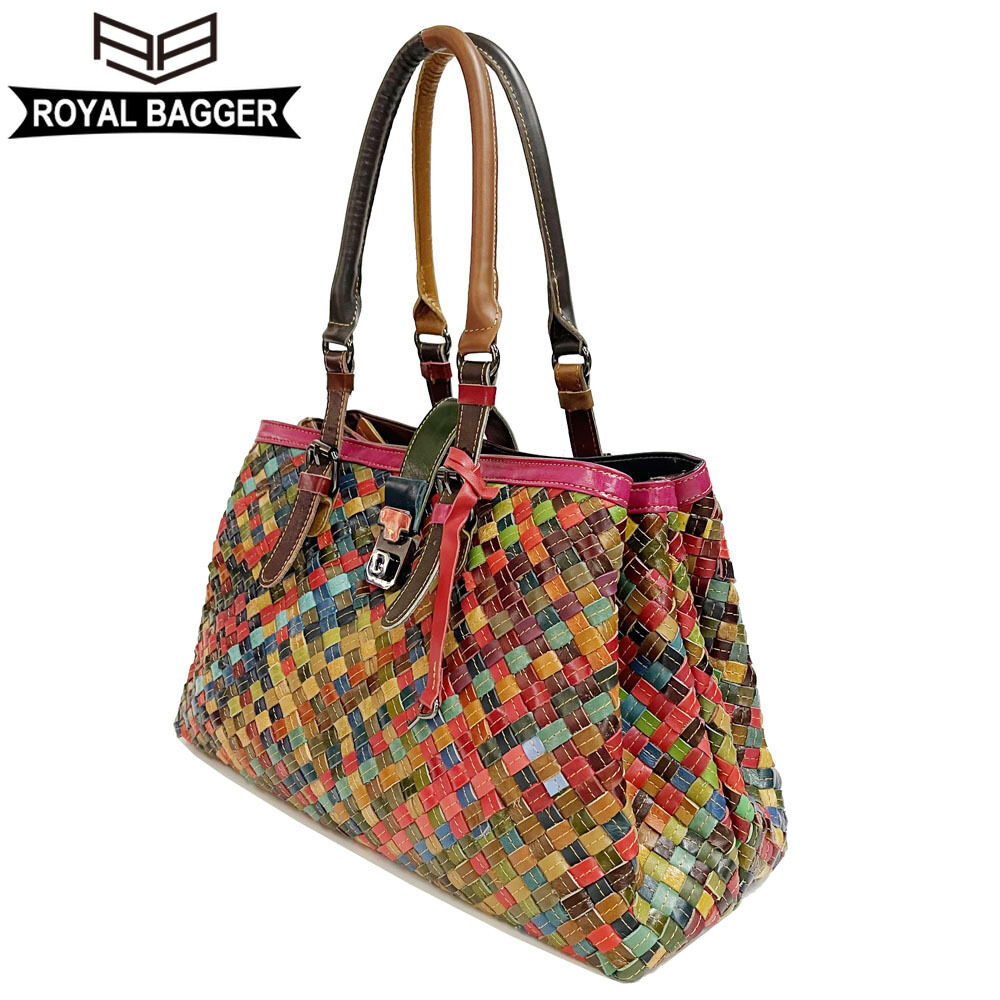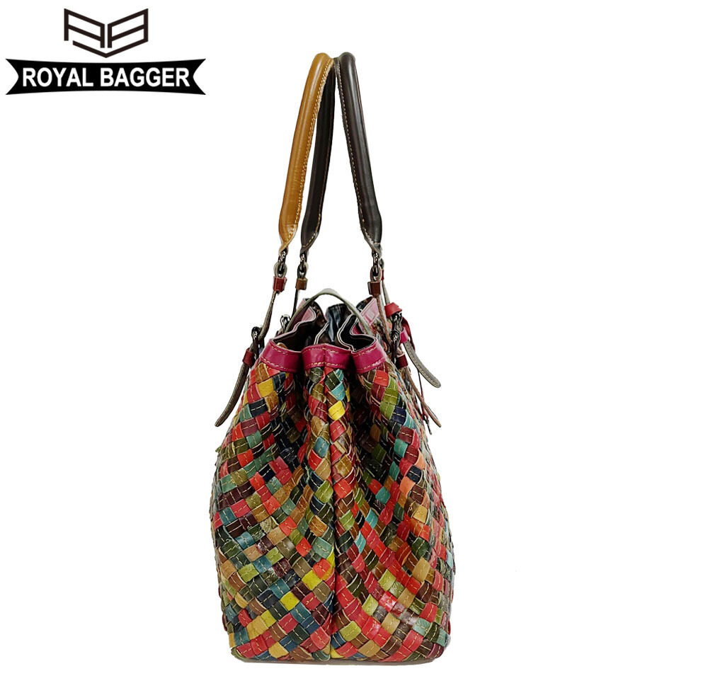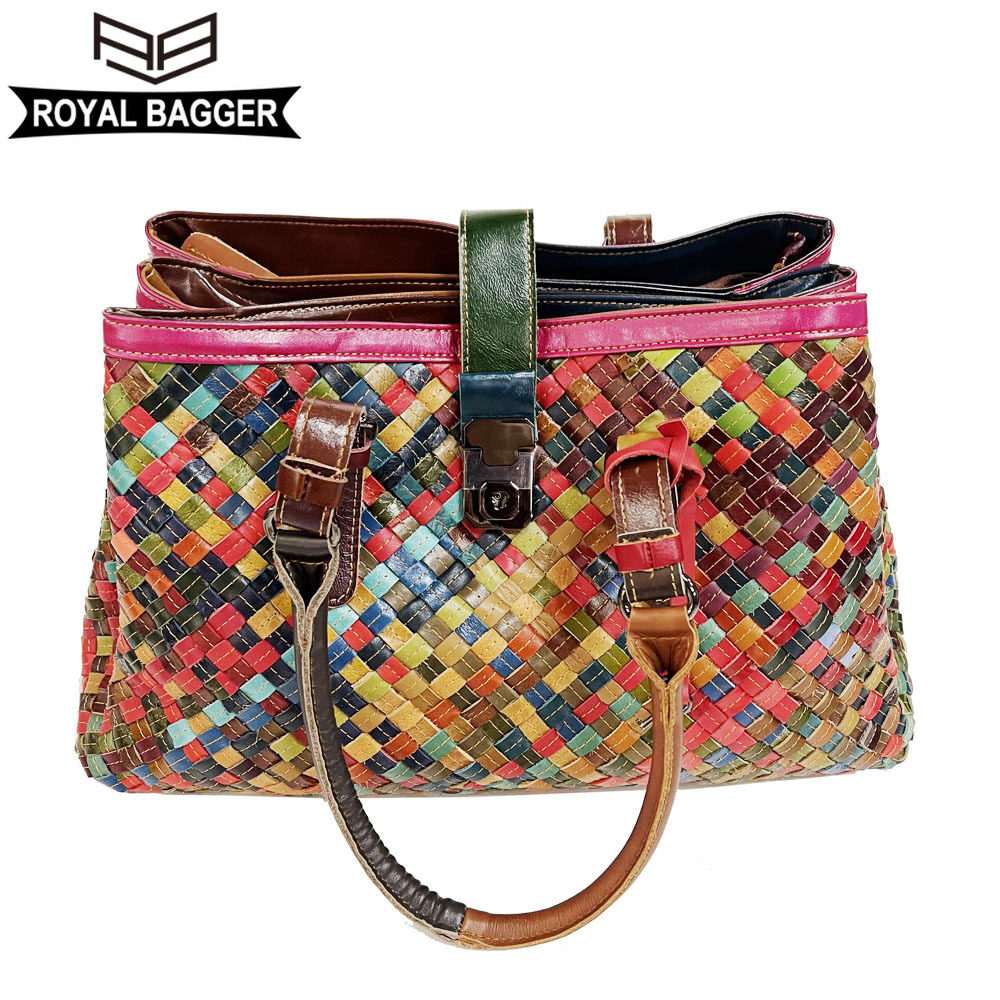 Royal Bagger New Top-Handle Bags for Women Genuine Leather Casual Retro Ladies Tote Bags Large Capacity Weave Girl Shoulder Bags
