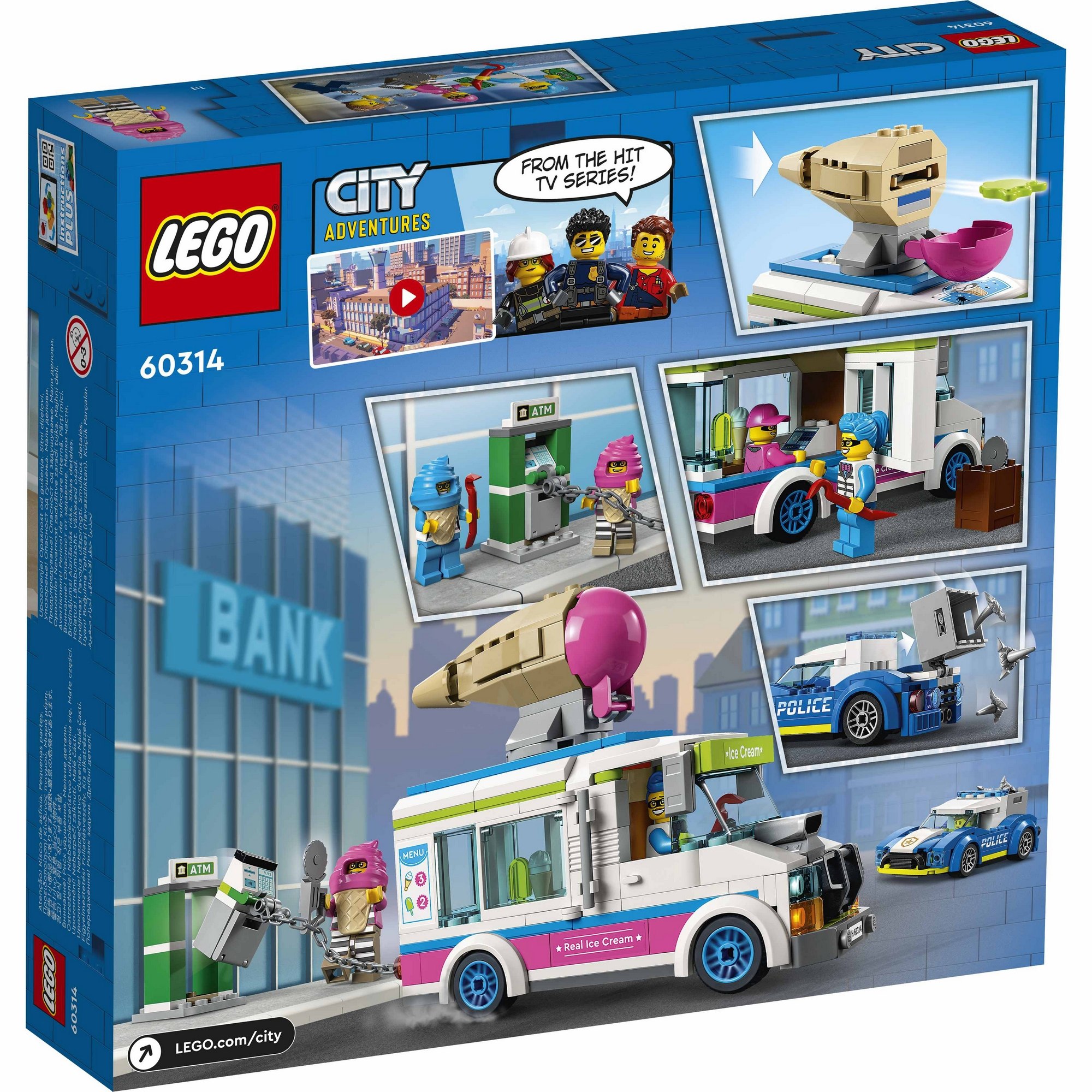 A 317-piece set with an ice cream van, police car, ATM setting and 3 minifigures, including 2 LEGO® City TV characters.
