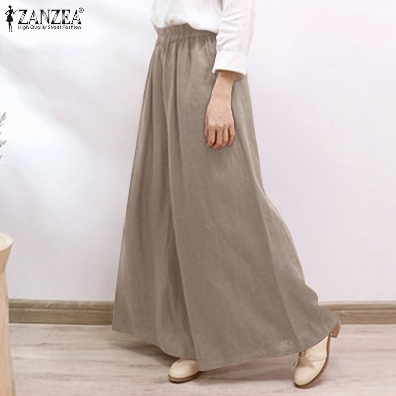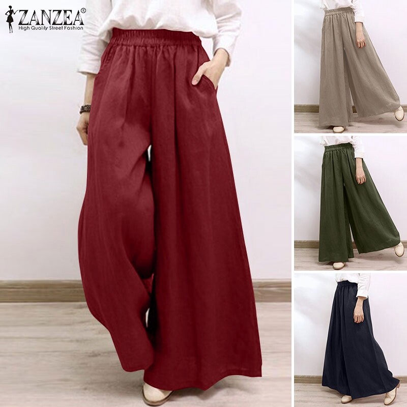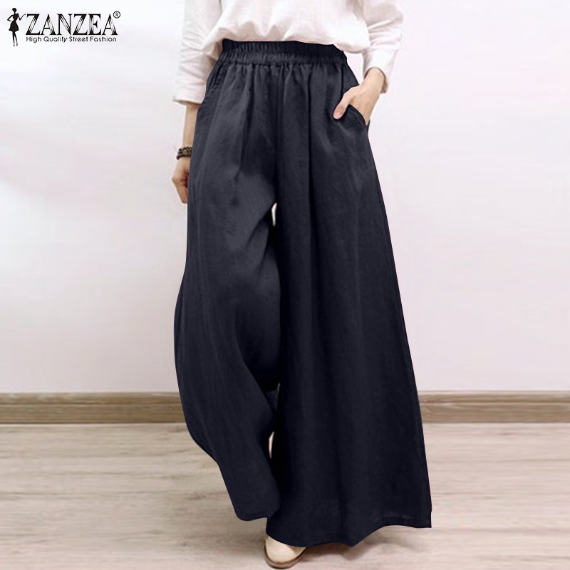 ZANZEA Women Casual Baggy Solid Color Thin Pants Wide Legs Elastic Waist Long Trousers