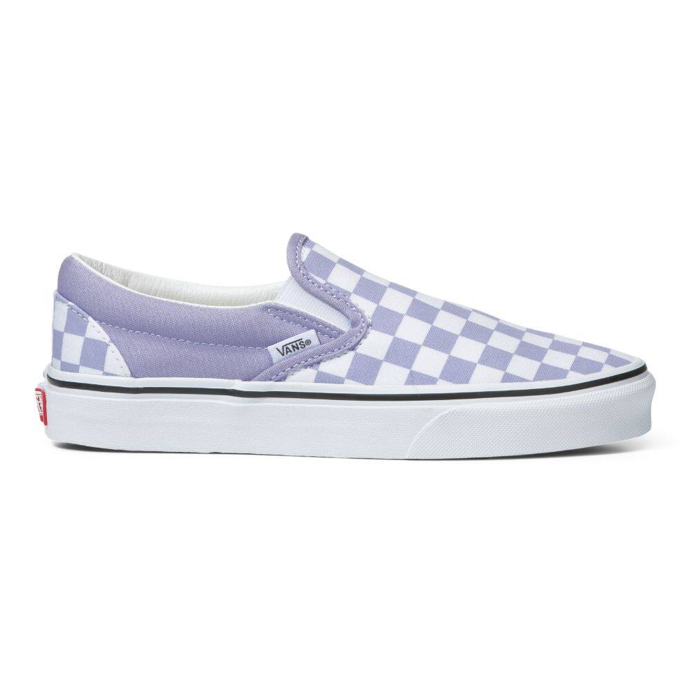 The Color Theory Classic Slip-On features sturdy low profile slip-on canvas uppers with the iconic Vans checkerboard print, padded collars, elastic side accents, and signature rubber waffle outsoles.