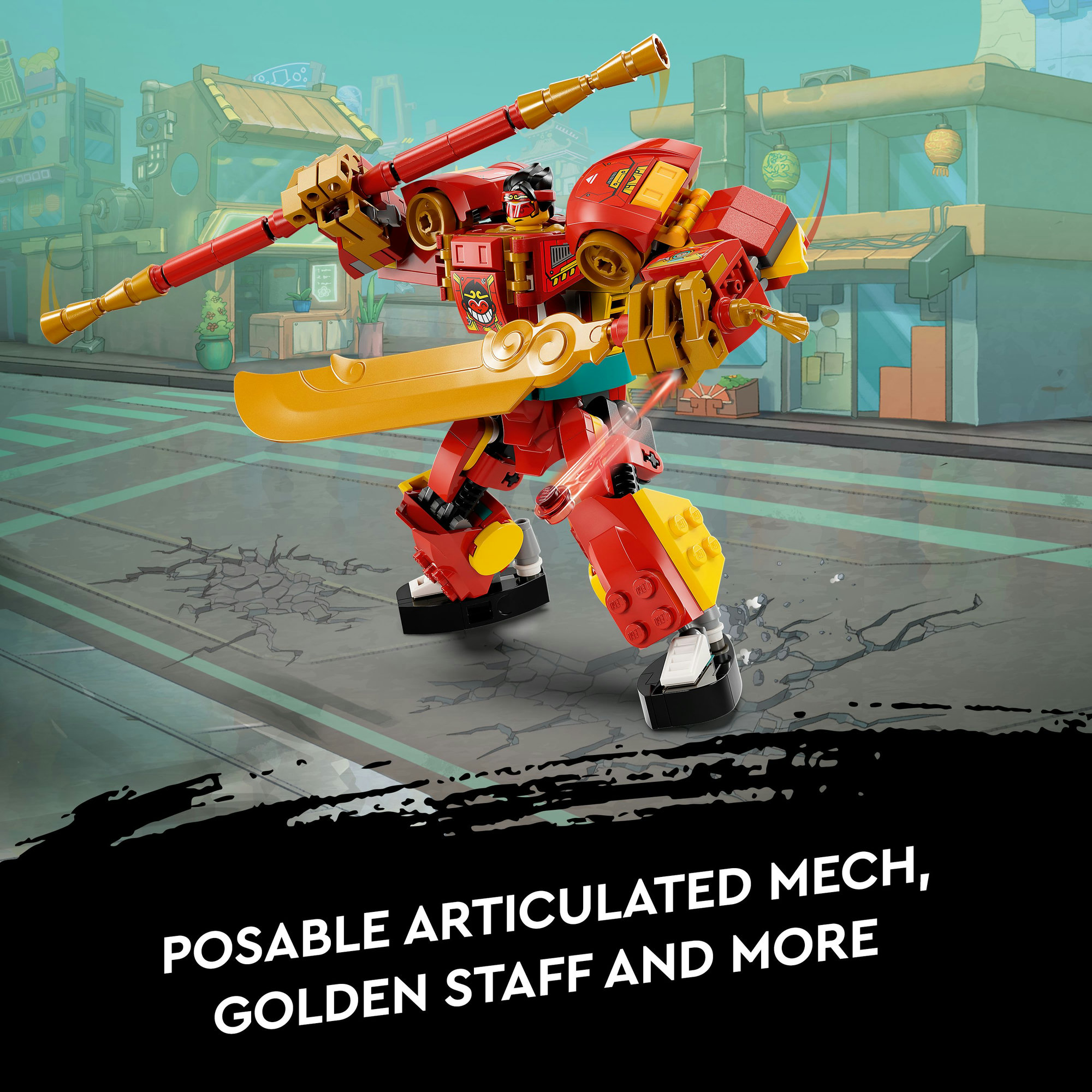 Monkie Kid’s mech can hold a golden sword and Golden Staff.