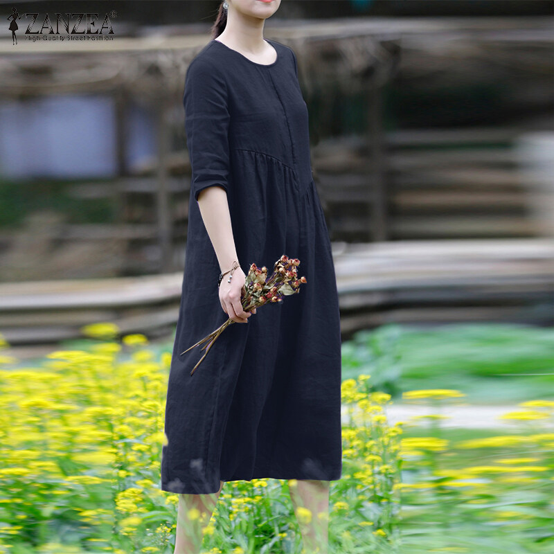 ZANZEA Women Leisure Cotton Pleated Short Sleeve Midi Dresses Bohemian Round Neck Sundress #8