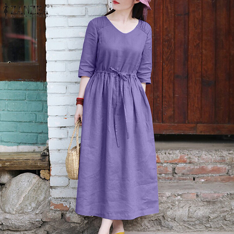 ZANZEA Womens Simple Vintage V-Neck Tie Waist Midi Dress Casual Loose Plain Sundress #8