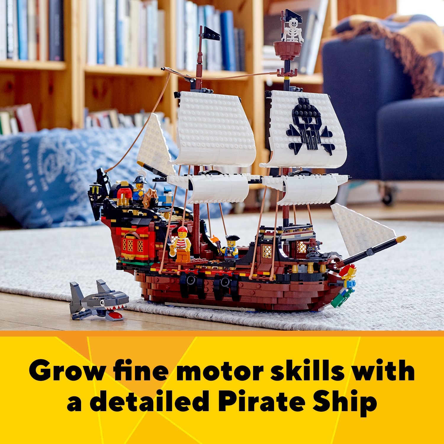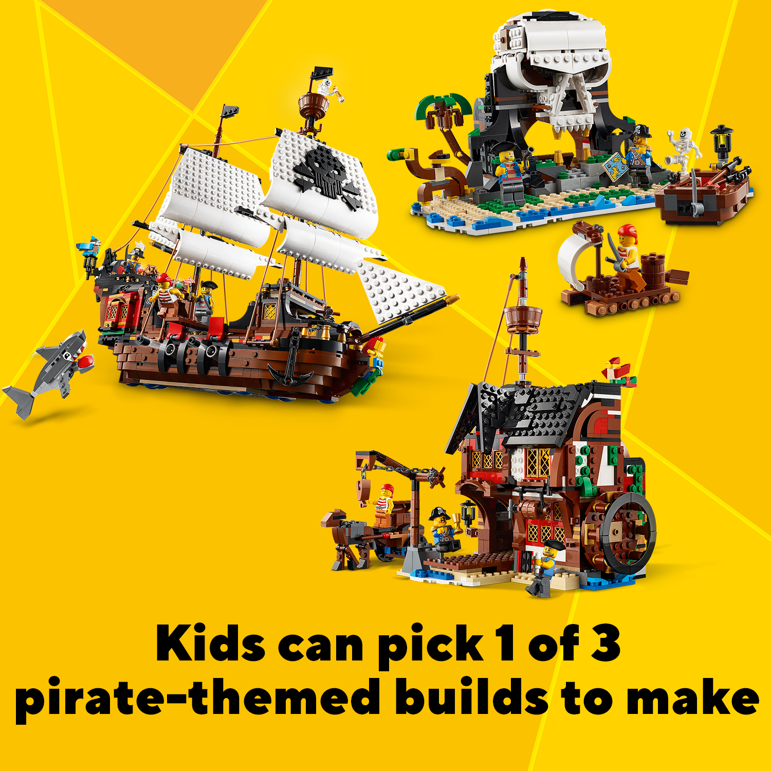 Kids can choose 1 of 3 pirate-based models to create, a massive Pirate Ship, Pirates’ Inn or Skull Island, or free their imagination and build something completely unexpected. Full of details to boost imaginative play.