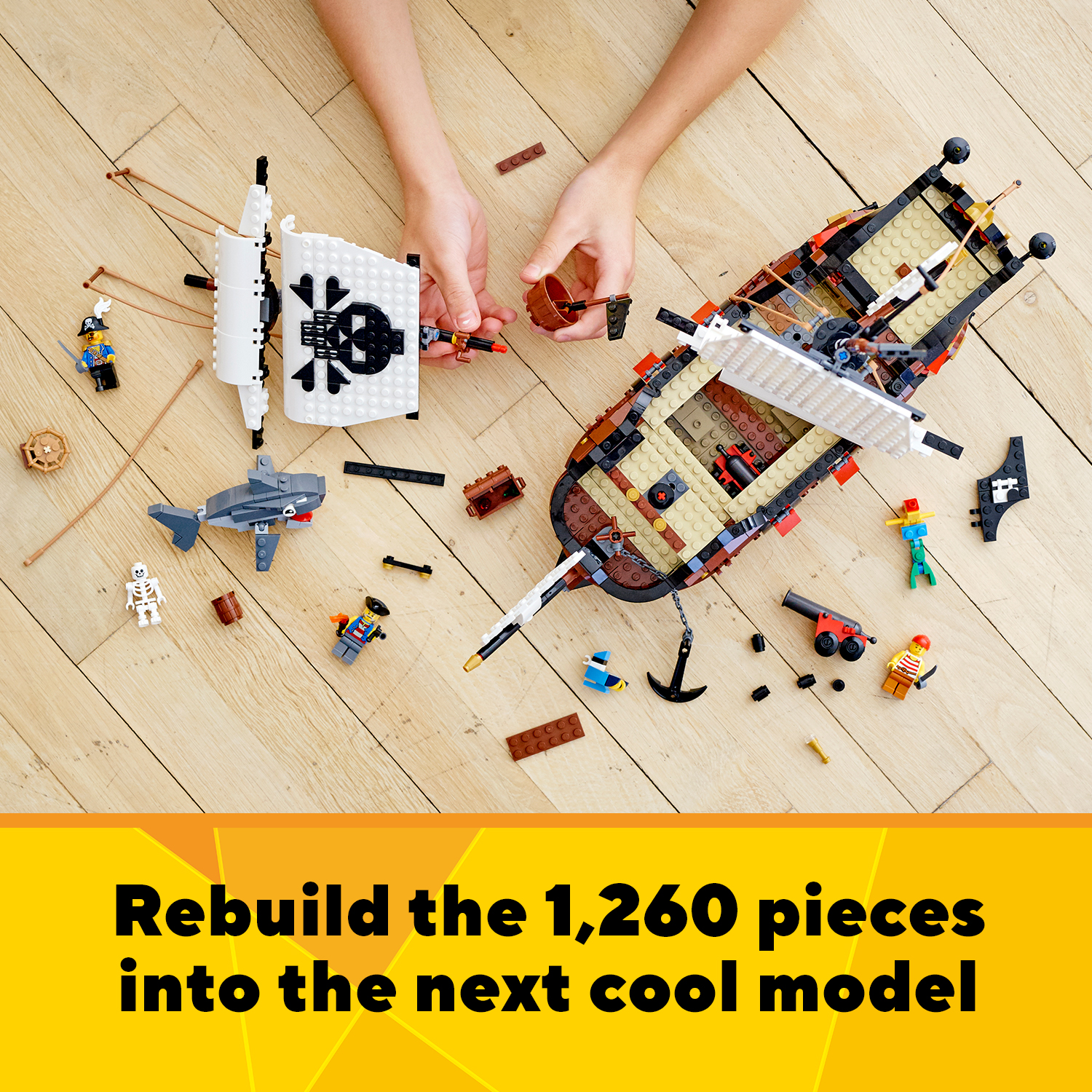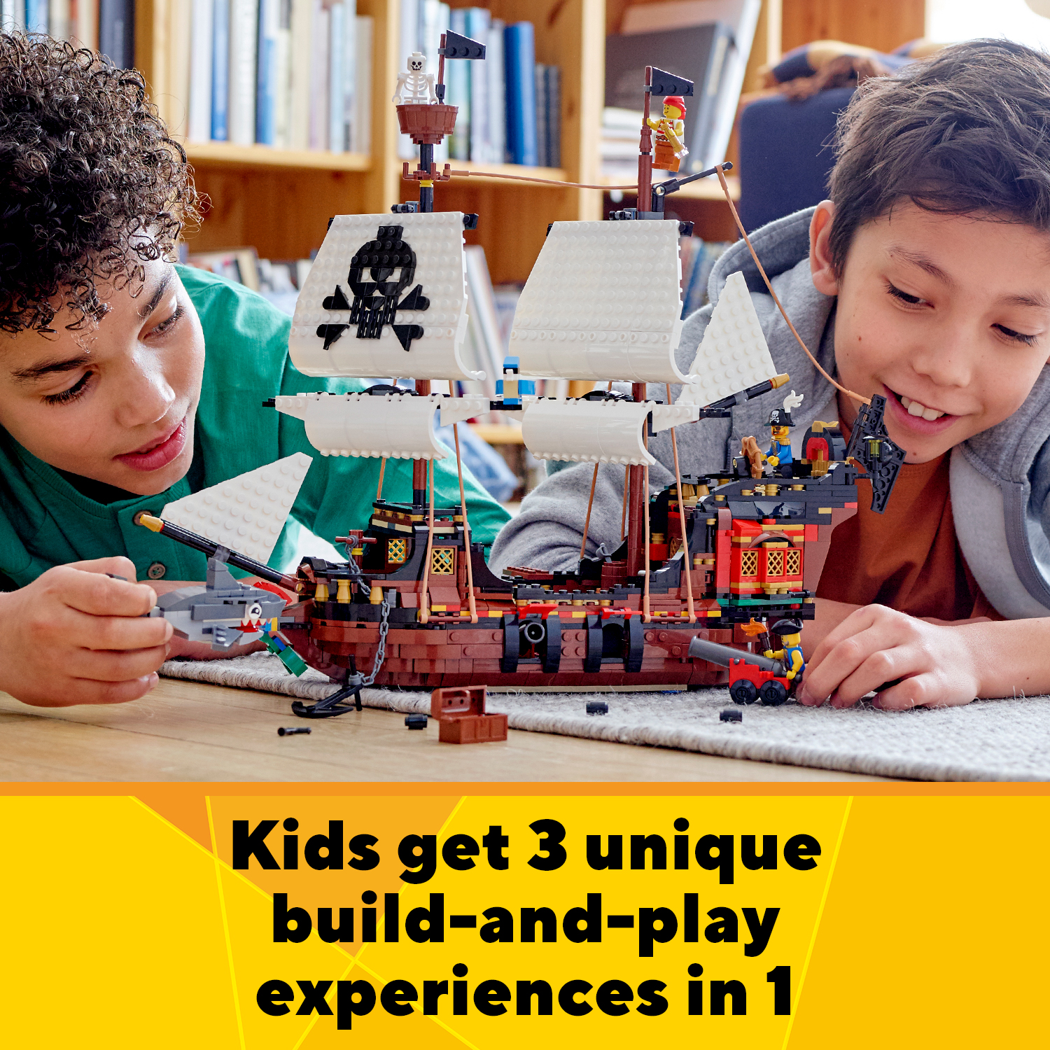 The set includes a captain, 2 crew members and a skeleton. Kids can use them in any 1 of the 3 models they choose to build. The minifigures make great story starters for thrilling pirate-themed adventures!
